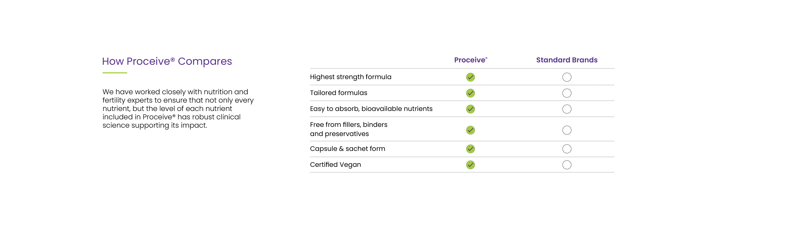 Our unique formulations of amino acids, vitamins, minerals and nutrients provide the raw materials to support the nutritional needs of the reproductive system. Many preconception and pregnancy vitamins don’t include nutrients at the levels needed for optimal nourishment. We have worked closely with nutrition and fertility experts to ensure that not only every nutrient, but the level of each nutrient included in Proceive® has robust clinical science supporting its impact.