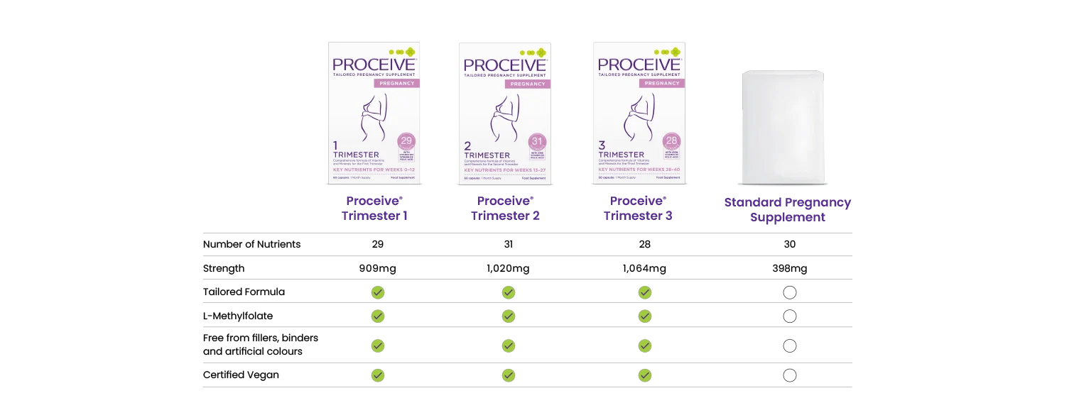 When trying to conceive and while pregnant its important to eat a clean, healthy, balanced diet, and so we believe that only the purest, active nutrients should go into our products and nothing else. That’s why you won’t find any fillers, binders or preservatives in the Proceive® range.